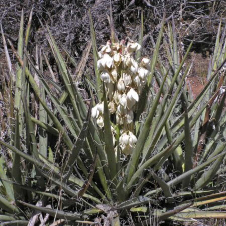 Long, narrow, spine-tipped leaves are arranges in a spiral and are sharply pointed. They reach up to 30 in. long, while the flowering stem may reach 40 in., bearing clusters of large, bell-shaped, sweet-smelling white flowers in the spring. Large banana-shaped fruit, which is described as tasting like sweet potatoes when roasted, range from 4 to 6 in. long. The Yucca was an important source of food and leaves for basket making to natives.