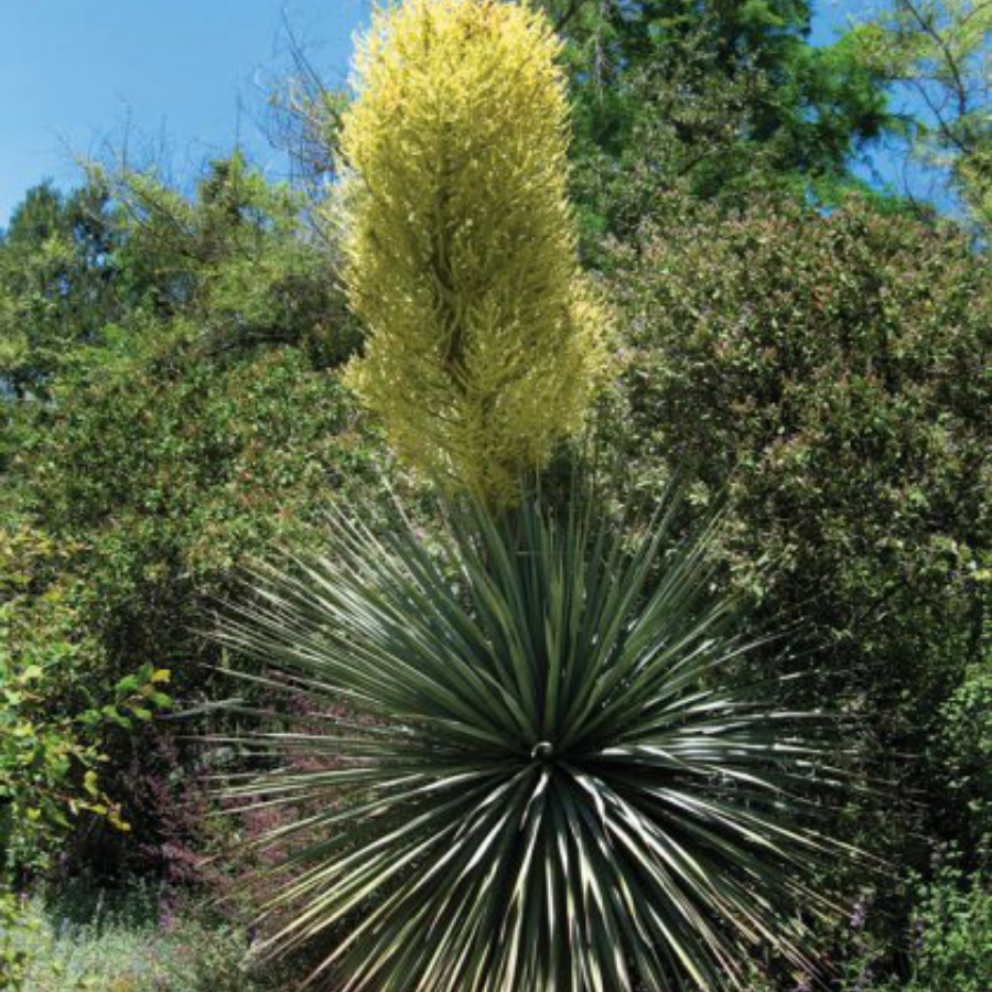 Narrow, pointed, silvery-blue leaves, up to 3 ft. long, fan out in a circular shape at the base of this evergreen shrub. One or more bloom stalks shoot up, 4 to 6 ft. high, forming a grassy head made up of thousands of tiny white flowers that are slightly fragrant. This plant is extremely drought tolerant and makes a bold accent piece in the garden or in a container.